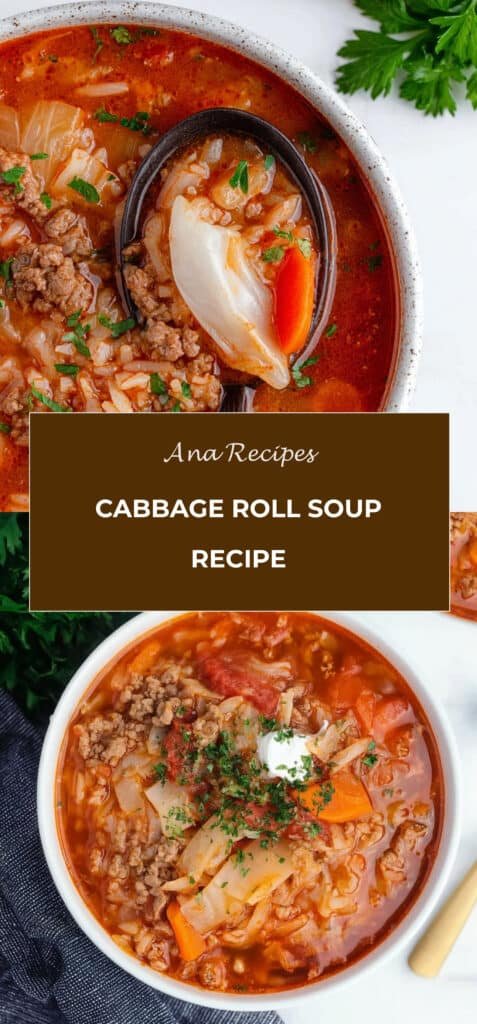 Hearty cabbage roll soup with ground beef, cabbage, rice, and vegetables simmered in a rich tomato-based broth for a comforting meal.