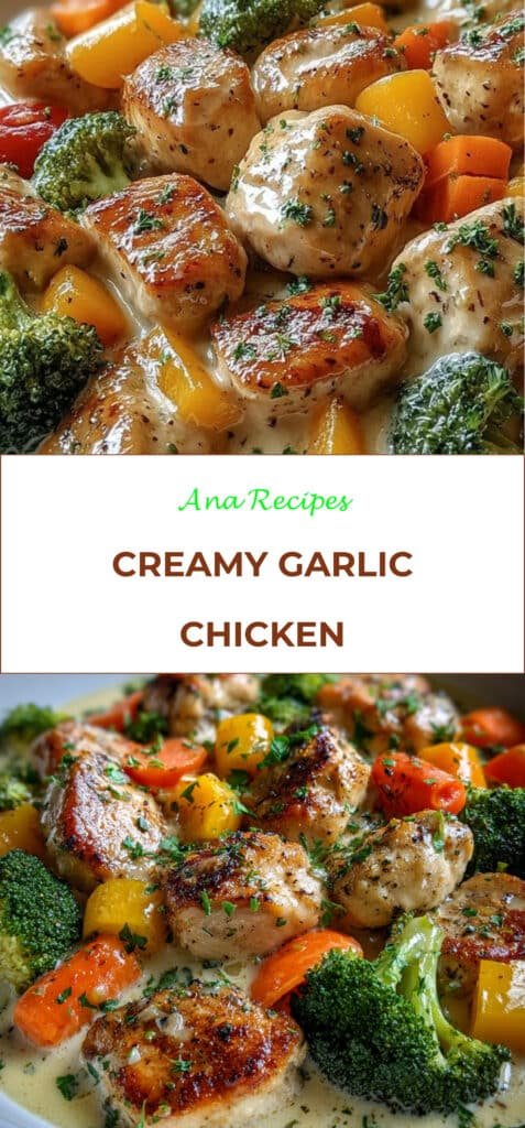 Serve hot, spooning the creamy garlic sauce over the chicken and vegetables. Garnish with fresh parsley for a bright, fresh finish.