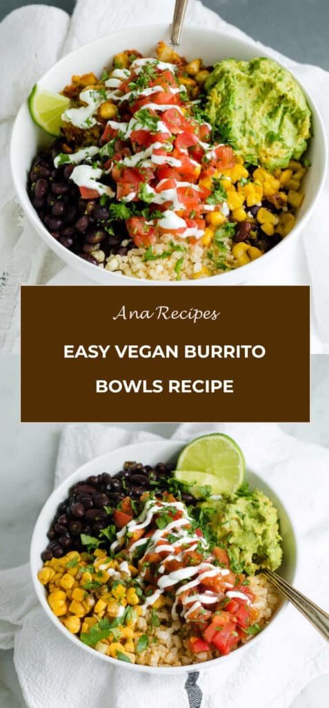Easy vegan burrito bowls packed with black beans, corn, cilantro lime quinoa, and fresh toppings for a quick, healthy, and satisfying meal.