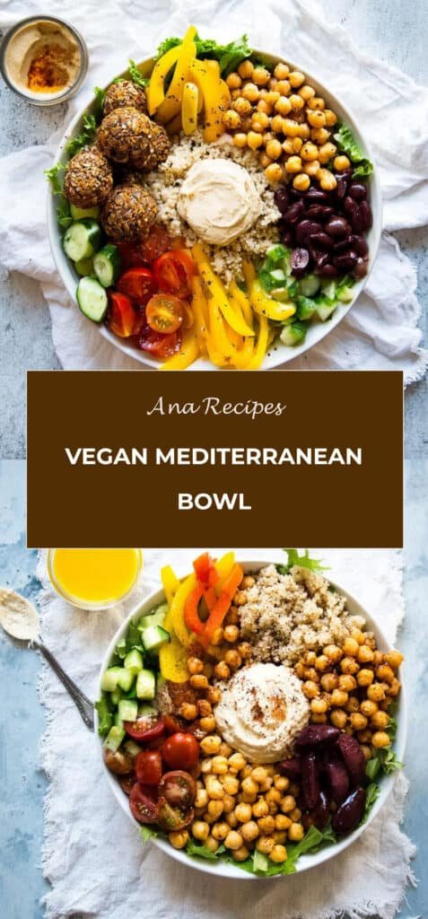A vibrant vegan Mediterranean bowl loaded with quinoa, roasted chickpeas, fresh vegetables, and creamy hummus for a healthy, protein-packed meal.
