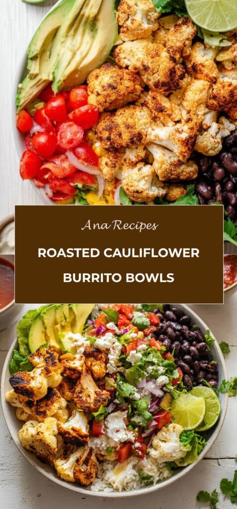 Fresh and flavorful roasted cauliflower burrito bowls loaded with rice, black beans, corn, salsa, avocado, and cilantro for a healthy plant-based meal.