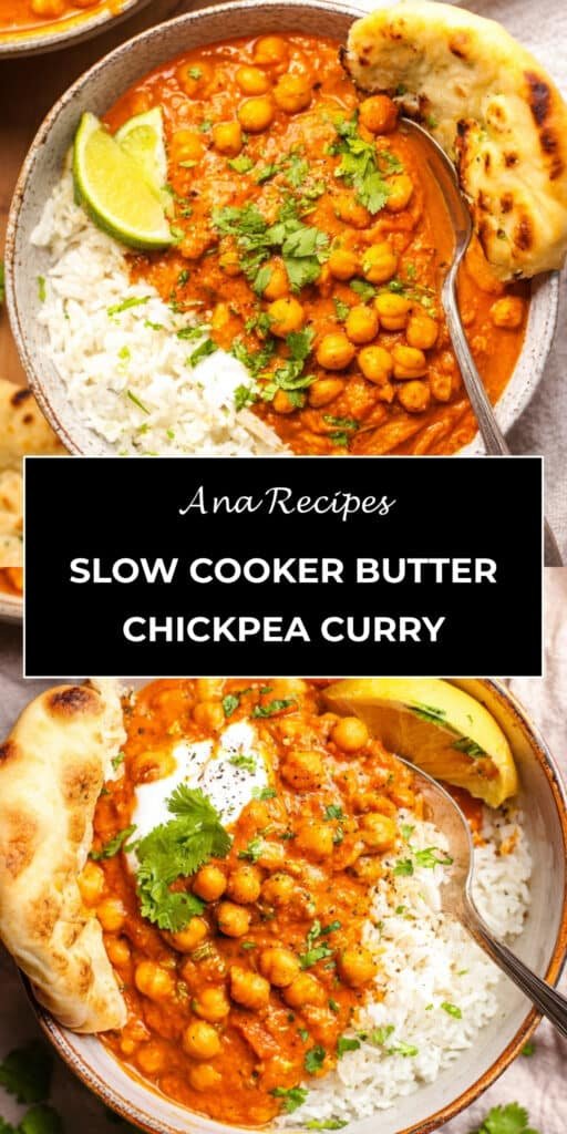 An easy Slow Cooker Butter Chickpea Curry made with creamy tomato sauce, butter, and aromatic spices. Vegetarian, comforting, and perfect for meal prep.