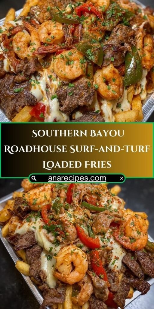 Southern Bayou Roadhouse Surf-and-Turf Loaded Fries is a bold, flavorful, and satisfying recipe that brings together the essence of Southern comfort food with the vibrant taste of Cajun cuisine. This dish combines the heartiness of sirloin steak, the succulence of shrimp, and the indulgence of cheddar cheese sauce with the rustic appeal of smoky fries.