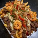 Southern Bayou Roadhouse Surf-and-Turf Loaded Fries is a bold, flavorful, and satisfying recipe that brings together the essence of Southern comfort food with the vibrant taste of Cajun cuisine. This dish combines the heartiness of sirloin steak, the succulence of shrimp, and the indulgence of cheddar cheese sauce with the rustic appeal of smoky fries.